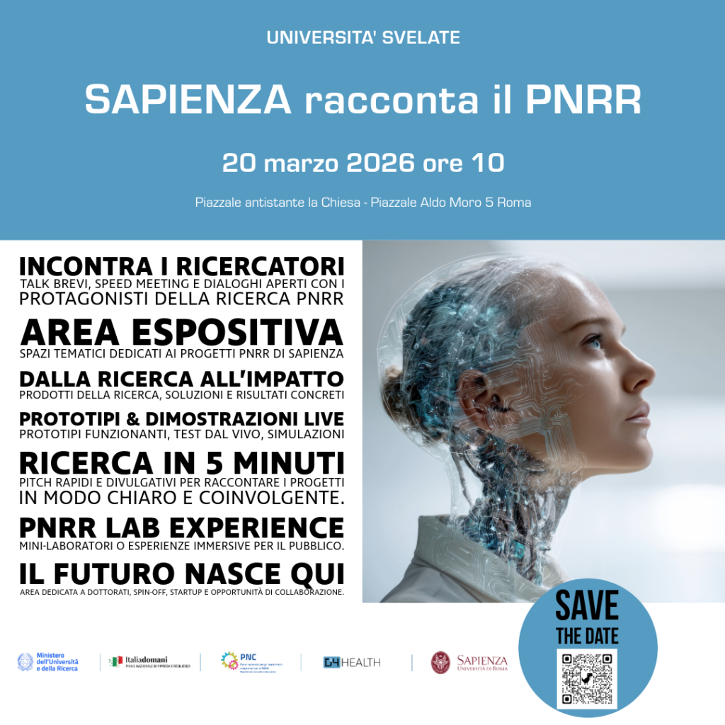 In occasione della Giornata Nazionale delle Università “Università Svelate”, istituita e patrocinata dalla CRUI (Conferenza dei Rettori delle Università Italiane) e dal Ministero dell’Università e della Ricerca, il 20 marzo, Sapienza Università di Roma apre le sue porte ospitando le tre Fondazioni nate nell’ambito del PNRR e del PNC, con l’obiettivo di presentare l’impatto delle attività di ricerca avviate in questi anni.
