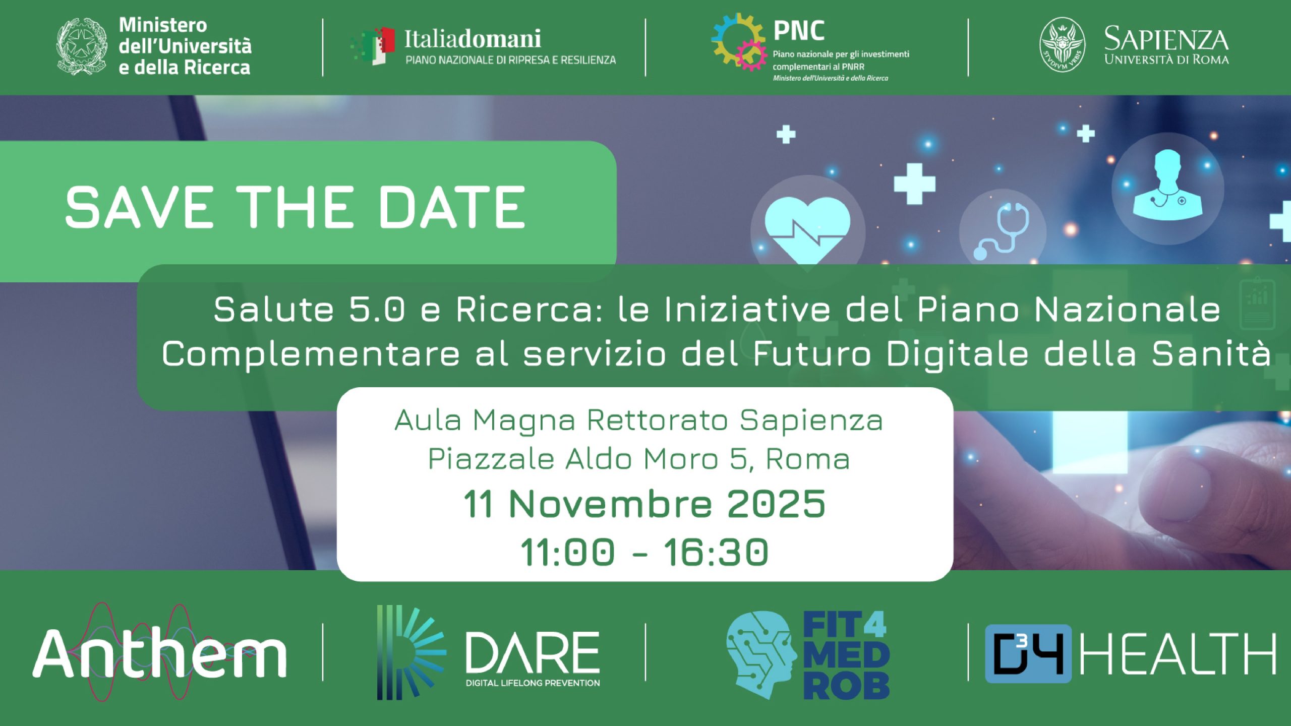 Aula magna Rettorato Sapienza piazzale Aldo Moro 5, Roma11 novembre 2025Unisciti all’incontro dedicato alle quattro Iniziative del MUR per un confronto su tecnologie e percorsi innovativi in ambito sanitario e assistenziale. Con la partecipazione dei Ministri Orazio Schillaci (Salute) e Anna Maria Bernini, l’evento sarà un momento chiave per riflettere sul ruolo strategico della ricerca per una sanità più digitale, inclusiva e sostenibile. ...